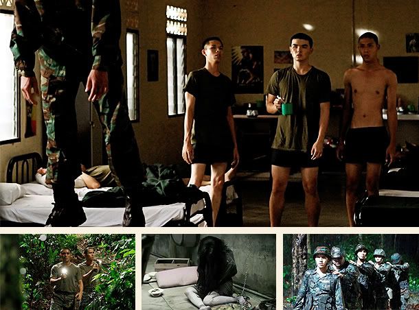 Precisamente su introducción, sus primeros diez minutos, llegan a crear alguna expectativa gracias a las historias que cuenta un soldado a sus compañeros, y como van enlazándose mediante flashbacks logrados por los pelos. Digamos que la dirección de Chan sigue al dedillo, con sus propias limitaciones, el libro de estilo de una película de horror oriental. Tanto a nivel argumental como en el resto. Por ejemplo, la definición de personajes es lamentable, los pobres soldados son bastante planos y en dicha línea son interpretados. Obviamente, y dado lo poco que pueden sonar los nombres de los actores, no es algo que nos deba extrañar. También los sustos son bastante comedidos, este hecho no creo que sea achacable a la falta de experiencia de Chan. Como director tenía un par de películas más en el tintero, pero de una temática típica de su país: la comedia melodramática con mucho romance. Sin embargo, para ser la primera vez que rueda apariciones espectrales, ataques psíquicos y hasta posesiones, como ya os he dicho, la dosis de fantasmagoría no se queda corta, no lo hace mal, manteniendo el pulso y alcanzando una tensión funcional, nada más. Probablemente no ha llegado a ser más aterradora porque el presupuesto no daba para escenas, efectos o localizaciones espectaculares.