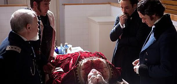 Tras las presentaciones solo resta quitarse de la cabeza cualquier ida previa, obviamente cercana a la realidad, para afrontar El Enigma del Cuervo (The Raven). Como thriller “hollywoodiense” se aleja lo suficiente de la verdadera vida del autor, del que hace uso y uso abuso para el desarrollo de la trama, como para presentarnos a un hombre que no fue en absoluto, aunque se agradece profundamente el esfuerzo llevado a cabo para ser fieles a la obra del escritor. Así, recorreremos de una forma muy espectacular, incluso con toques de “buddies movies”, los distintos cuentos macabros que Poe escribiese, cobrando vida a través de varios asesinatos. Incluso la época concreta está representada con una fidelidad pasable, pese a que las actitudes de los personajes busquen semejarse en demasía al cine actual de Guy Ritchie, que me parece una modernización algo vacua bien sea del Londres victoriano o, ahora, los jóvenes Estados Unidos, parte este.
