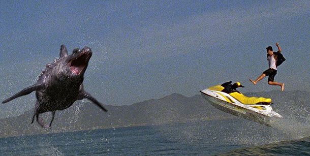 Qué mejor manera de empezar nuestro ranking de tiburones freaks que con los amigos de The Asylum. Más grande, más fuerte, mejor… Este podría ser el lema de cabecera de la productora norteamericana famosa tanto por plagiar/homenajear/ridiculizar los grandes blockbusters del momento, como por sus megalómanas monsters movies plagadas de actores de segunda fila y efectos CGI de baja estofa. Megashark Vs. Crocasaurus podría ser perfectamente el buque insignia de este último tipo de producciones. El menú incluye un gigantesco tiburón saltando por encima de un portaaviones, un cocodrilo que derriba helicópteros con su cola y la no menos terrorífica presencia del gran Jaleel White, más conocido por su alter ego de Steve Urkel - “¿He sido yo?” – .