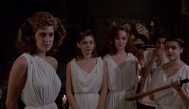 Sin embargo, no todo son malas noticias. Si no, no estaríamos hablando de ella casi treinta años después de su estreno. El comienzo y el final de Killer Party se merecen un hueco en el las vitrinas de la serie B más genuina… y casposa. En una suerte de inspiración directa otra vez de la saga Scream, en concreto de su cuarta parte, los minutos iniciales de esta fiesta asesina son un juego de cine dentro del cine que funcionan a la perfección, son enérgicos y divertidos, y prometen, quizás, más de lo que luego pueden llegar a cumplir. En su desarrollo, hay pequeñas perlas visionarias: por ejemplo, teniendo en cuenta que la mayor parte del material data de 1978, se plantea que una chica novata, Vivia, pueda gastar bromas a las veteranas de una hermandad, cuando la posterior evolución del slasher demostró que esas normas sociales eran irrompibles en el género. Y, sobre todo, antes que Night of the Demons (Kevin Tenney, 1988) y antes que The House on Sorority Row (Mark Rosman, 1983) o The Dorm That Dripped Blood (Stephen Carpenter y Jeffrey Obrow, 1982), Killer Party ya tenía posesiones demoníacas, y hermandades y novatas de consecuencias letales. Lo que nos llevaría directos al final: si se dispone del suficiente buen humor, el clímax es uno de los momentos más hilarantes y, por qué no, cutre-aterradores, de los ochenta, y tiene algún truco visual que aún hoy sigue funcionando.