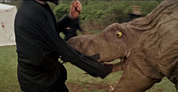 El dinosaurio es un tipo metido adentro de un disfraz barato de goma.